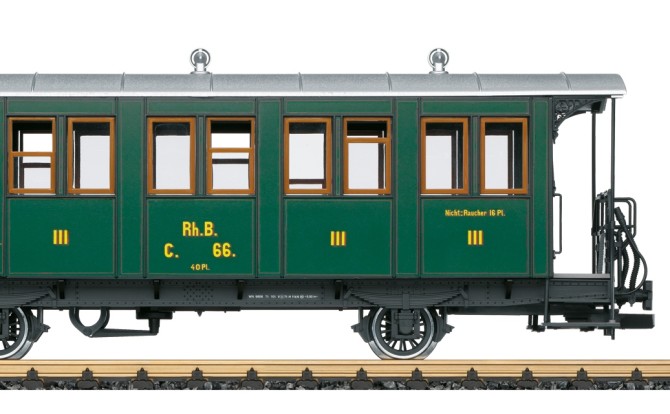 Das LGB Modell bildet einen Personenwagen der 3. Klasse der RhB nach. Ausführung in der grünen Farbgebung der damaligen Landquart-Davos-Bahn, so wie der Wagen heute bei der RhB als Museumswagen im Einsatz ist. Originalgetreue Farbgebung und Beschriftung.